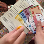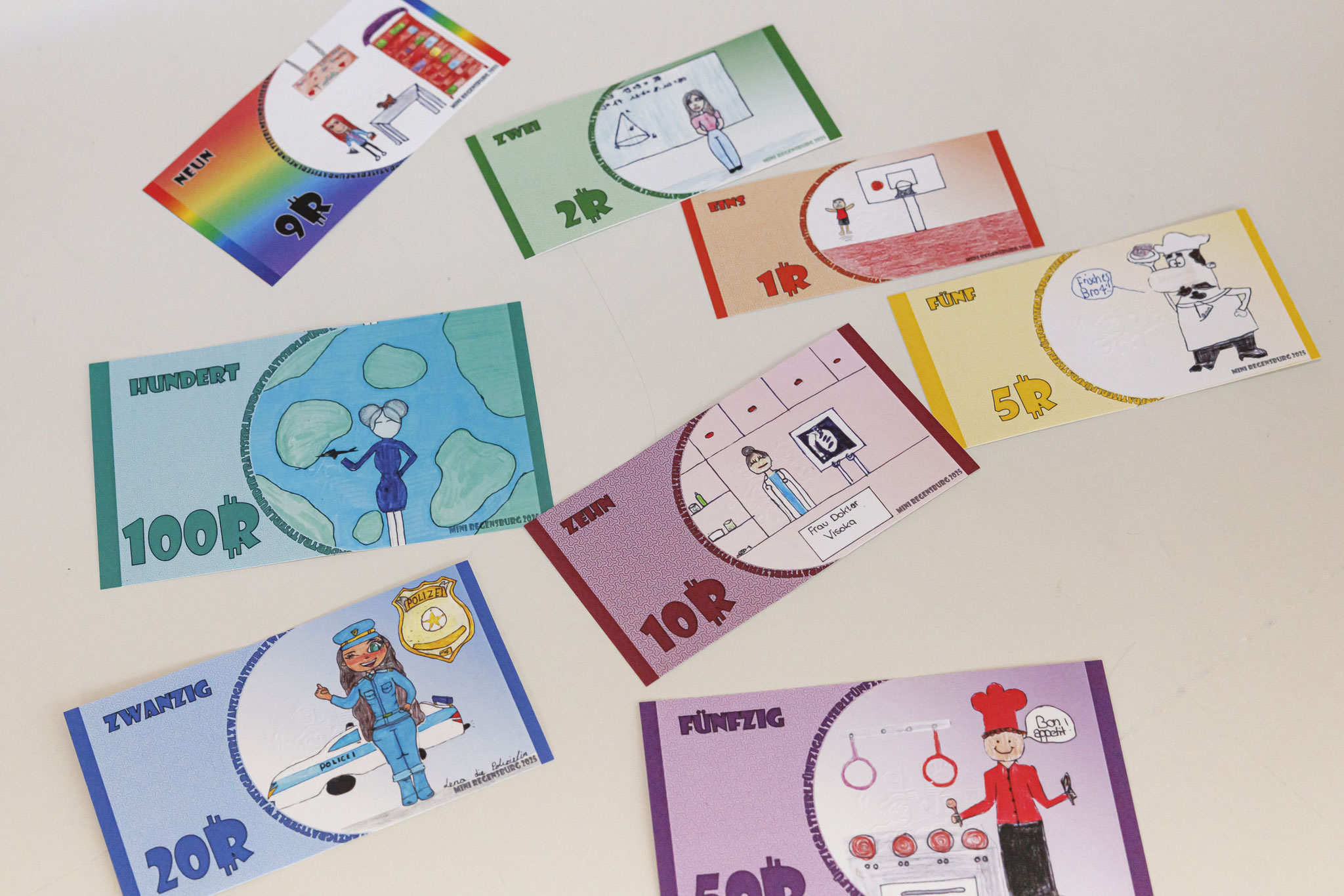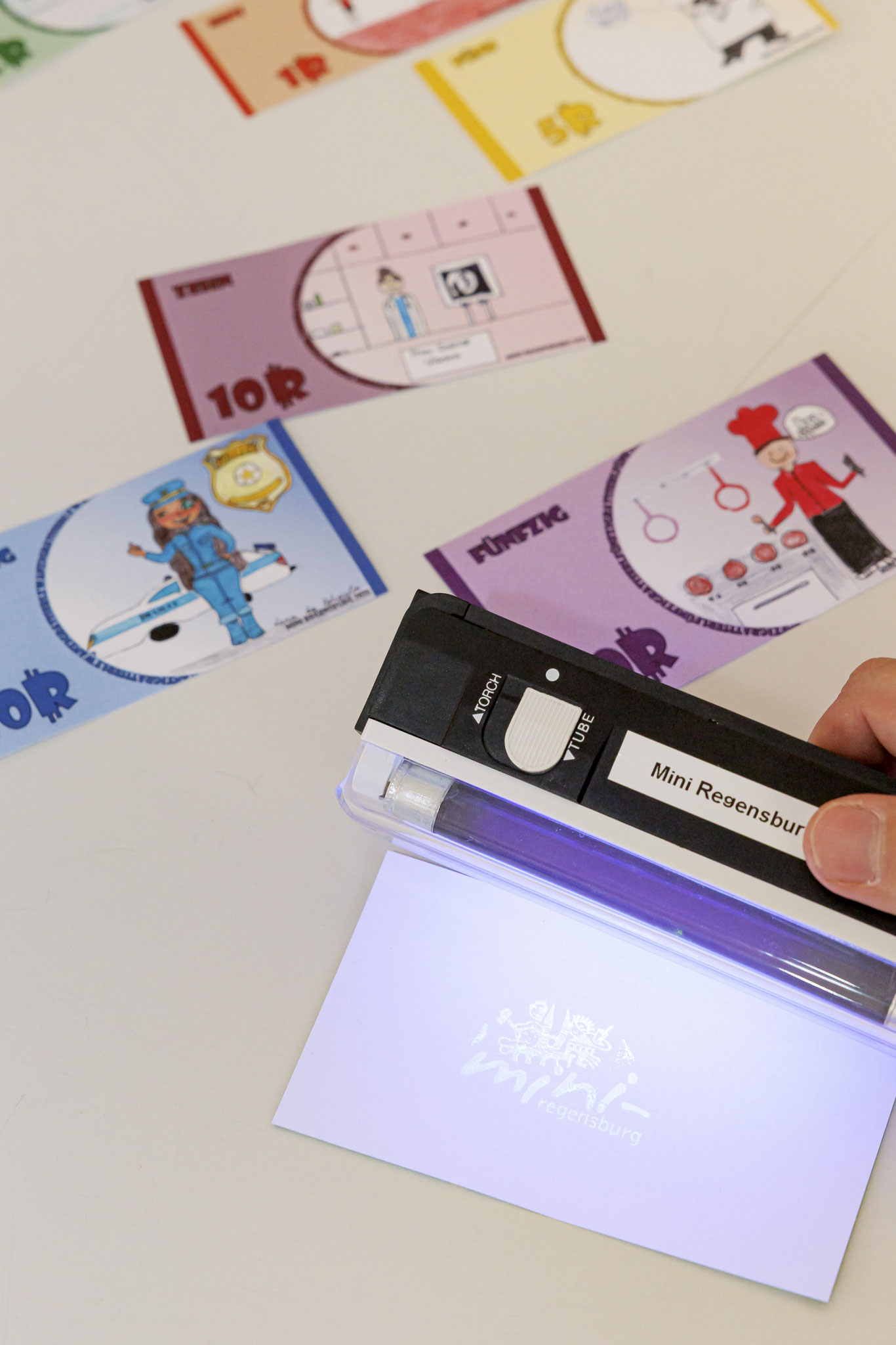 Damit sind sie für Kinder, die nicht so gut sehen können, noch leichter zu unterscheiden. Außerdem sind die Scheine mit dem Mini Regensburg Logo geprägt und mit UV-Stempeln markiert. Die UV-Stempel kann man nur mit besonderen Schwarzlichtlampen sehen, damit sind die Geldscheine besonders fälschungssicher.